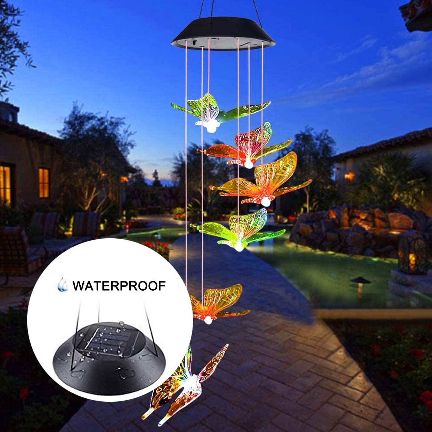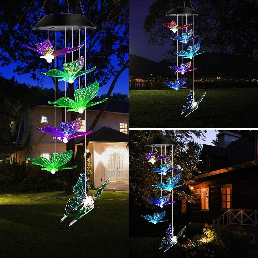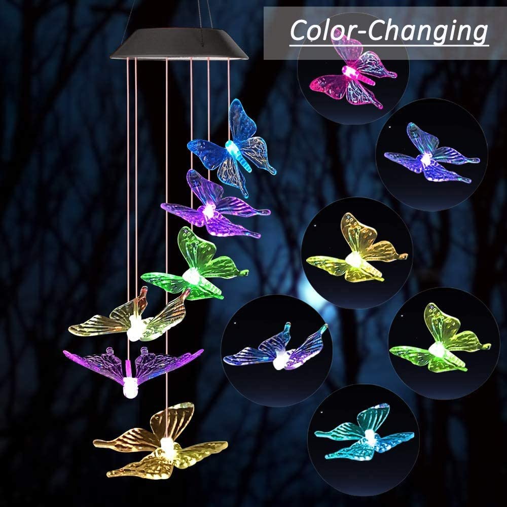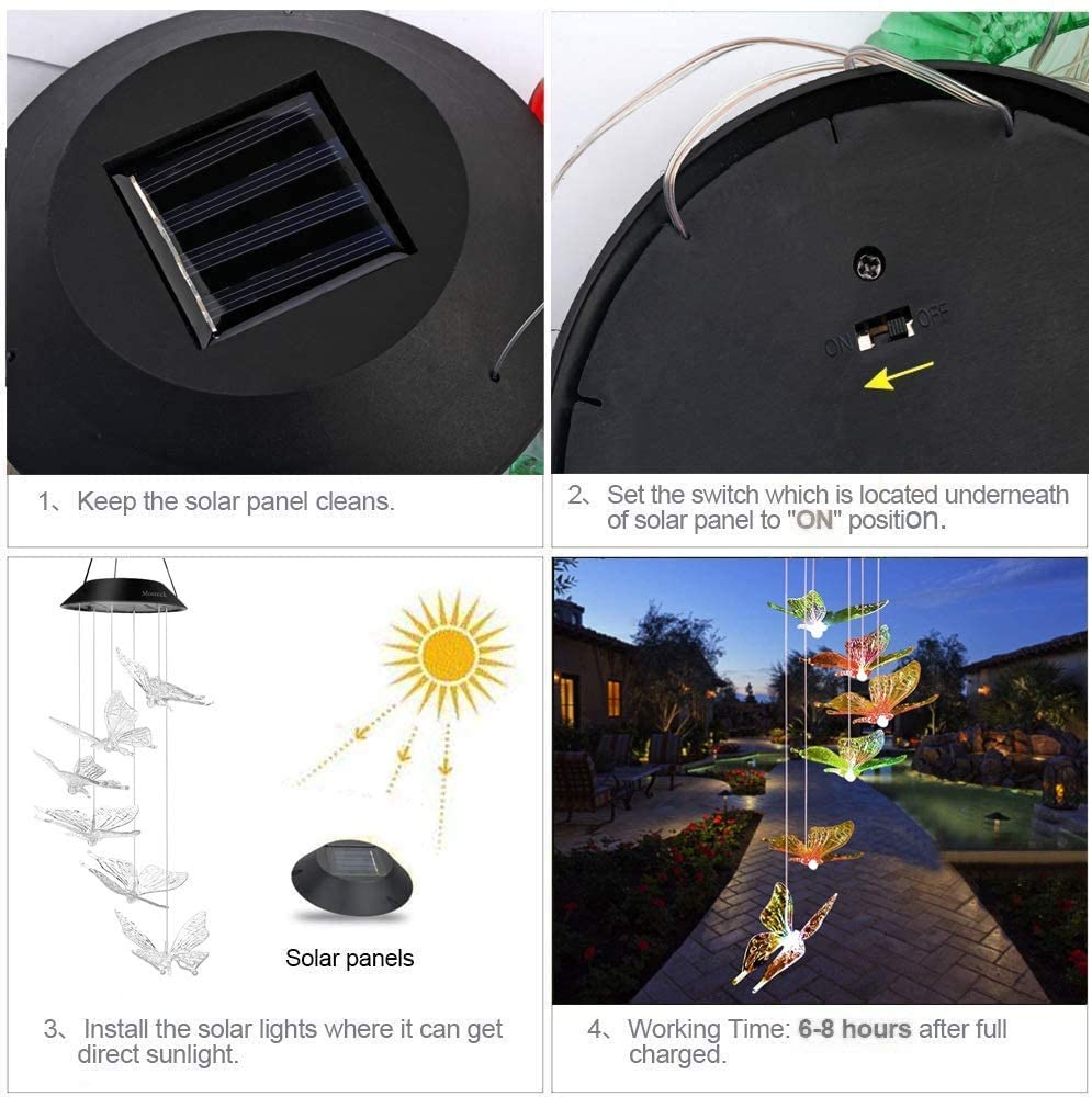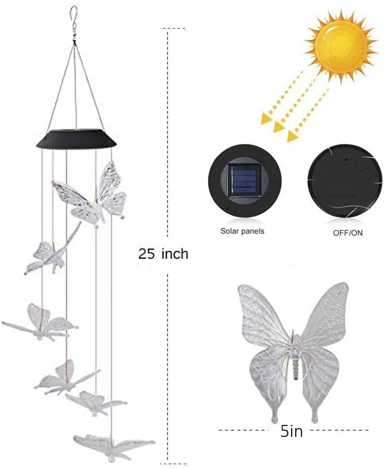 Mutil-Color Changing Chime Lights: Changing colors alternating randomly between Red, Green, Orange, Blue, Yellow, Purple, shine and colorful butterfly fly in the night.
